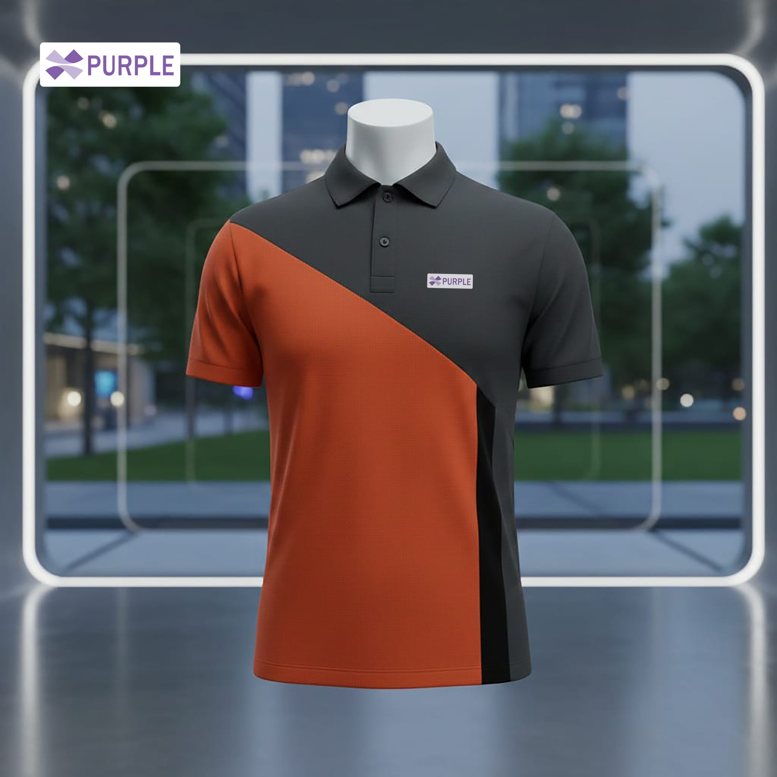 This product is a branded polo shirt from the clothing line ‘PURPLE’ featuring a distinct blue and orange geometric design .Mixed color slim fit polo shirt. Features three buttons placket with China Lacoste PK fabric; featuring premium 100% combed compact organic China Lacoste. The t-shirt has a soft touch, making it very comfortable for all-day wear.